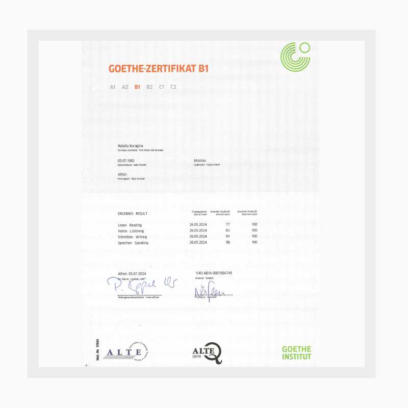 Ich habe mein Studium an der Staatlichen Linguistischen Universität Minsk als Englischlehrer abgeschlossen. An der Universität habe ich auch Deutsch, Spanisch, Französisch und Italienisch studiert. Durch den Umzug nach Griechenland kam Griechisch auf meine Liste. Die Arbeit mit Ausländern hat mich außerdem dazu veranlasst, eine berufliche Umschulung an der Moskauer Staatlichen Universität zu absolvieren und ein Diplom als Lehrer für Russisch als Fremdsprache zu erwerben. Als Ergebnis der Arbeit mit Kindern erhielt ich ein Zertifikat der Russischen Universität der Völkerfreundschaft im Rahmen des Programms „Russischunterricht für Kinder von Landsleuten im Ausland“.