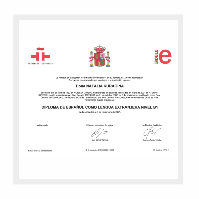 Я закончила Минский Государственный Лингвистический Университет, получив квалификацию преподаватель английского языка. В университете я также изучала немецкий, испанский, французский и итальянский языки. Переезд в Грецию добавил к моему списку греческий язык. Работа с иностранцами побудила меня также пройти профессиональную переподготовку в Московском Государственном Университете и получить диплом преподавателя русского языка как иностранного. В результате работы с детьми был получен сертификат Российского Университета дружбы народов по программе «Преподавание русского языка детям соотечественников за рубежом».